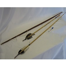 CONJUNTO DE UM ARCO E DUAS FLECHAS. ARCO (136 CM) CONFECCIONADO EM MADEIRA, COM CORDA EM PALHA (FIBRA VEGETAL). FLECHAS (99 CM E 141 CM) COM CORPO EM BAMBU, PONTA EM MADEIRA TRABALHADA, E UMA PENA NA OUTRA EXTREMIDADE.