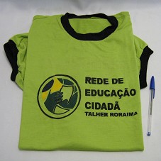CAMISETA EM MALHA VERDE, DE MANGA CURTA. NA FRENTE, A INSCRIÇÃO 'REDE DE EDUCAÇÃO CIDADÃ / TALHER RORAIMA', E LOGOMARCA. ATRÁS, 'O POVO QUE OUSA SONHAR CONSTRÓI UM BRASIL POPULAR'.