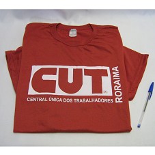 CAMISETA (TAM G) EM MALHA VERMELHA, DE MANGA CURTA. NA FRENTE, EM BRANCO, A INSCRIÇÃO 'CUT RORAIMA / CENTRAL ÚNICA DOS TRABALHADORES'.