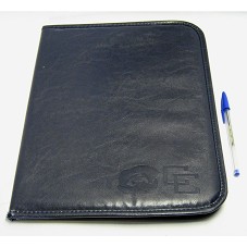 PASTA (36X26,5 CM) CONFECCIONADA EM COURO TINGIDO DE AZUL MARINHO, FORRADA INTERNAMENTE EM TECIDO PRETO. NA FRENTE, A INSCRIÇÃO 'CC' AO LADO DE DESENHO REPRESENTANDO ESCULTURA LOCALIZADA NO ESPELHO D'ÁGUA DO PALÁCIO DO ITAMARATY, EM BRASÍLIA. ACOMPANHA BLOCO DE NOTAS (TAM A4) COM CABEÇALHO CONTENDO A INSCRIÇÃO 'REUNIÃO DE CÚPULA BRASIL-CARICOM / BRASÍLIA, 26 DE ABRIL DE 2010', EM QUATRO IDIOMAS.