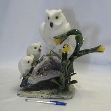 ESCULTURA (30X21X22 CM) CONFECCIONADA EM PEDRAS SEMI-PRECIOSAS, REPRESENTANDO UMA CORUJA BRANCA COM DOIS FILHOTES, ESCULPIDOS EM MÁRMORE IMPERIAL, POUSADOS EM UMA DRUSA DE AMETISTA, TENDO AO LADO DIREITO, UMA PLANTA ESCULPIDA EM SERPENTINITA, QUE POSSUI TRÊS FLORES ESCULPIDAS EM CALCITA. CORUJA E FILHOTES SÃO ENCAIXADOS NA AMETISTA, POR PINOS METÁLICOS. ACONDICIONADA EM CAIXA DE ACRÍLICO TRANSPARENTE, COM TAMPA DE MADEIRA. ACOMPANHA FOLHETO COM INFORMAÇÕES SOBRE A PEÇA.