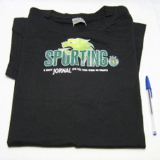 CAMISETA (TAM XL) EM MALHA PRETA, DE MANGA CURTA. NA FRENTE, ESTAMPA EM VERDE E BRANCO, CONTENDO A INSCRIÇÃO 'SPORTING / O ÚNICO JORNAL QUE PÕE TUDO VERDE NO BRANCO'; E BRASÃO DO TIME 'SPORTING PORTUGAL'.