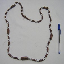 COLAR COM CONTAS CILÍNDRICAS EM TOM TERRACOTA, INTERCALADAS COM CONTAS BRANCAS DESENHADAS.