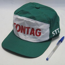 BONÉ EM TECIDO VERDE, COM A FRENTE BRANCA, ONDE HÁ A INSCRIÇÃO 'CONTAG' EM VERMELHO. NAS LATERAIS, 'FETAGS' E 'STTRS'.