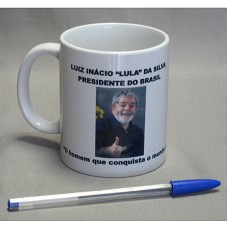 CANECA DE CERÂMICA (9,5X8X8 CM), NA COR BRANCA. POSSUI ESTAMPA COM FOTOGRAFIA DO PRESIDENTE LULA E A INSCRIÇÃO 'LUIZ INÁCIO LULA DA SILVA / PRESIDENTE DO BRASIL / O HOMEM QUE CONQUISTA O MUNDO COM SUA COMPETÊNCIA E CARISMA'. DO OUTRO LADO, BRASÃO DA 'PREFEITURA MUNICIPAL DE MESQUITA / ARTUR MESSIAS / PREFEITO'. ACOMPANHA CARTÃO DE VISITA DO AGENTE.