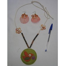 CONJUNTO DE COLAR E PAR DE BRINCOS. COLAR CONFECCIONADO EM CORDÃO DE ALGODÃO CRU, COM PINGENTE CIRCULAR EM FELTRO VERDE, COM APLIQUE DE UMA PÁSSARO LARANJA E UMA ROSA ROXA. NA PARTE POSTERIOR DO PINGENTE, ETIQUETA COM LOGOMARCA DE COMEMORAÇÃO DOS 50 ANOS DE BRASÍLIA. POSSUI DETALHES, NO CORDÃO, EM TIRAS DE REVISTAS ENROLADAS E FLORES DE FRIVOLITÊ. PAR DE BRINCOS EM FOLHAS ESQUELETIZADAS, NA COR LARANJA, E FLORES EM FRIVOLITÊ. ACOMPANHA CARTÃO DA ARTISTA. ACONDICIONADO EM SACOLA DE PAPEL CRAFT.