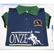 CAMISA GOLA PÓLO (TAM G), EM MALHA AZUL MARINHO, DE MANGAS CURTAS NA COR VERDE, COM DETALHES EM AMARELO. NA FRENTE, DESENHO DE UM HOMEM MONTADO À CAVALO, E A INSCRIÇÃO 'ONZE'. NA PARTE SUPERIOR, MESMO DESENHO BORDADO E A INSCRIÇÃO 'REGIMENTO MARECHAL DUTRA / PONTA PORÃ'. ATRÁS, O NÚMERO '3'.