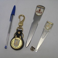 CONJUNTO COMPOSTO POR: CHAVEIRO (11,5 CM) EM COURO PRETO, COM MOSQUETÃO EM METAL DOURADO E PINGENTE EM MESMO MATERIAL CONTENDO O BRASÃO DO '11º REGIMENTO DE CAVALARIA MECANIZADO'; UM BÓTON COM BRASÃO DO REGIMENTO; UM ABRIDOR DE CORRESPONDÊNCIA (15,5 CM) EM METAL PRATEADO; E UM MARCADOR DE PÁGINA EM MESMO MATERIAL. TODAS AS PEÇAS POSSUEM O BRASÃO DO 11º REGIMENTO DE CAVALARIA MECANIZADO. ACONDICIONADO EM ESTOJO DE PAPELÃO AZUL MARINHO.