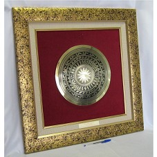 QUADRO (64,5X65 CM) COM MOLDURA DOURADA TEXTURIZADA. POSSUI FUNDO EM VELUDO VINHO, COM PASSE-PARTOUT EM TECIDO BEGE E FRISO DOURADO. AO CENTRO, PLACA CIRCULAR (29,7 CM), CONFECCIONADA EM METAL DOURADO. PLACA REPRESENTANDO UMA MANDALA, COM UMA ESTRELA DE VÁRIAS PONTAS AO CENTRO, E CÍRCULOS CONCÊNTRICOS ONDE HÁ DESENHOS DIVERSOS GRAVADOS. NA PARTE INFERIOR DA MOLDURA, PLACA COM A INSCRIÇÃO 'COM OS MELHORES CUMPRIMENTOS, DUONG NGUYEN TUONG / EMBAIXADOR EXTRAORDINÁRIO E PLENIPOTENCIÁRIO DA REPÚBLICA SOCIALISTA DO VIETNAM'.