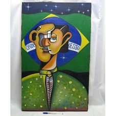 QUADRO (80X50 CM) SEM MOLDURA, COM PINTURA SOBRE TELA, TENDO AO FUNDO A BANDEIRA DO BRASIL. EM PRIMEIRO PLANO, FIGURA ESTILIZADA, MOSTRANDO UMA PESSOA COM O ROSTO MULTIFACETADO. NO CANTO INFERIOR DIREITO, ASSINATURA DO ARTISTA. ATRÁS, A INSCRIÇÃO 'T.M. / GILSON SACRAMENTO / 27/05/2010 / EU SOU SURDO / RIO DE JANEIRO / BRASIL'.