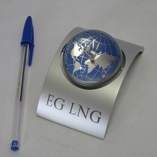 RELÓGIO DE MESA ( CM). FORMADO POR UMA ESFERA DE VIDRO COM ARMAÇÃO EM ALUMÍNIO, TENDO, EM UM DOS LADOS, RELÓGIO ANALÓGICO SOBRE FUNDO COM DESENHO DO MAPA MUNDI; DO OUTRO, LOGOMARCA DA EMPRESA 'EG LNG'. ESFERA FIXADA EM BASE DE METAL, NO FORMATO DE UM ARCO, ONDE HÁ A INSCRIÇÃO 'EG LNG'. ACONDICIONADO EM ESPUMA PRETA.
