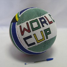 BOLA DE BASQUETE, REVESTIDA EXTERNAMENTE COM MIÇANGAS COLORIDAS, FORMANDO, AO CENTRO, A BANDEIRA DA ÁFRICA DO SUL. EM UMA DAS LATERAIS, A INSCRIÇÃO 'WORLD CUP'.