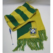 CACHECOL (147X17,5 CM) CONFECCIONADO EM LÃ ACRÍLICA, NAS CORES VERDE E AMARELO, COM FRANJAS NAS EXTREMIDADES. EM UM DOS LADOS, ESCUDO DA 'CBF' E A INSCRIÇÃO 'BRASIL'. DO OUTRO, SOBRE FUNDO AMARELO, 'BRASIL'. POSSUI LOGOMARCA DA 'NIKE'.