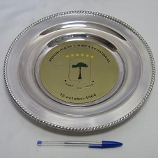 PRATO DECORATIVO / BAIXELA (2,5X29,7X29,7 CM) EM PRATA, COM BORDAS ELEVADAS. AO FUNDO, PLACA CIRCULAR EM METAL DOURADO, ONDE HÁ O BRASÃO DE GUINE EQUATORIAL E A INSCRIÇÃO 'REPÚBLICA DE GUINEA ECUATORIAL / 12-OCTUBRE-1968'. ACONDICIONADO EM ESTOJO FORRADO DE COURO VERMELHO, COM MESMO BRASÃO NA TAMPA.