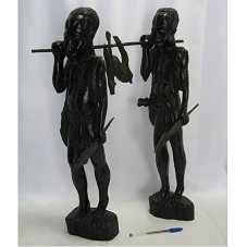 CONJUNTO DE DUAS ESCULTURAS (58,5 CM E 58 CM CADA), CONFECCIONADAS EM MADEIRA. REPRESENTA DOIS HOMENS NEGROS, CAÇADORES, CADA UM SEGURANDO UMA PONTA DE UM VARÃO, ONDE ESTÁ O ANIMAL CAÇADO. PARTES QUE COMPÕEM A PEÇA (VARÃO, ANIMAL, LANÇAS) ESTÃO SOLTAS DA ESCULTURA PRINCIPAL.