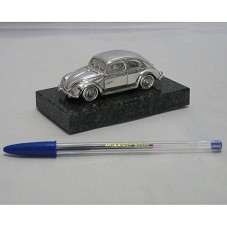MINIATURA DE UM FUSCA (3X8,5X3,5 CM), MODELO 1950, CONFECCIONADO EM METAL PRATEADO. NA PARTE INFERIOR DELE, A INSCRIÇÃO 'VOLKSWAGEN 1950'. FIXADO EM BASE DE MÁRMORE PRETO (1,5X11X6 CM). ACONDICIONADO EM CAIXA BRANCA, COM LOGOMARCA DA 'VOLKSWAGEN' NA TAMPA.