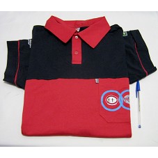 CAMISA (TAM G), EM MALHA AZUL MARINHO E VERMELHA, COM BOLSO FRONTAL. NESTE, ESTAMPA COM LOGOMARCA DO 'SINDICATO DOS METALÚRGICOS ABC' E DA 'COMISSÃO DE FÁBRICAS DOS TRABALHADORES NA VOLKS'.