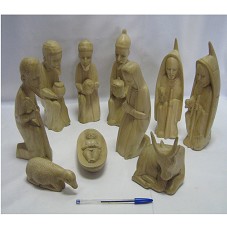 PRESÉPIO, COMPOSTO POR DEZ ESCULTURAS CONFECCIONADAS EM MADEIRA CLARA. SÃO ELAS: TRÊS REIS MAGOS (25 CM, 22,5 CM E 21,5 CM), AJOELHADOS E SEGURANDO POTES; DOIS PASTORES (26 CM CADA) COM CAJADO E SEGURANDO UMA OVELHA; UMA OVELHA (4X4X13 CM); UM BOI (13X10X7 CM); MARIA (22,5 CM); JOSÉ (23,5 CM) E MANJEDOURA COM O MENINO JESUS (4X16X7 CM). ACONDICIONADOS EM CAIXA DE PAPELÃO.