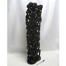 ESCULTURA EM ÉBANO (64 CM). COMPOSIÇÃO DE VÁRIAS FIGURAS HUMANAS (HOMENS E MULHERES) SOBREPOSTAS, FORMANDO UMA TORRE. NO TOPO, UMA FIGURA MASCULINA SE SOBRESSAI, PELO TAMANHO DIFERENTE. A MAIORIA DAS PESSOAS ESTÃO CARREGANDO ALGO: ALIMENTOS, VASOS, CESTAS, CÂNTAROS, E OUTROS.
