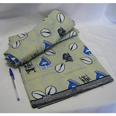 CORTE DE TECIDO (117X542 CM), DE FUNDO BEGE COM TEXTURA AZUL. POSSUI DESENHOS DE MÁSCARAS AFRICANAS; BÚZIOS; E A LOGOMARCA E NOME DA EMPRESA 'EG LNG'.