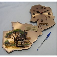 RELÓGIO DE PAREDE (37X34 CM) NO FORMATO DO MAPA DA ZÂMBIA, CONFECCIONADO EM MADEIRA COM ACABAMENTO FRONTAL EM CHAPA DE COBRE ESCOVADO E BORDAS POLIDAS. NA EXTREMIDADE ESQUERDA, UMA ZEBRA, EM ALTO RELEVO, COM UMA PAISAGEM PINTADA AO FUNDO. NA PARTE SUPERIOR, RELÓGIO ANALÓGICO E PLACA COM A INSCRIÇÃO 'ZAMBIA'. POSSUI PLACA METÁLICA CONTENDO A GRAVAÇÃO 'PRESENTED TO HIS EXCELLENCY MR. LUIZ INACIO LULA DA SILVA, PRESIDENT OF THE FEDERATIVE REPUBLIC OF BRAZIL / BY HIS EXCELLENCY MR. RUPIAH BWEZANI BANDA PRESIDENT OF THE REPUBLIC OF ZAMBIA / ON HIS STATE VISIT TO THE REPUBLIC OF ZAMBIA / 7TH TO 8TH JULY, 2010'. NO CANTO INFERIOR, ASSINATURA 'GASTONE'. ACONDICIONADO EM CAIXA DE PAPELÃO COM A INSCRIÇÃO 'GASTONE', SEM TAMPA.