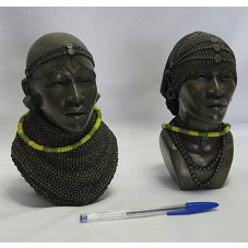 DUAS ESCULTURAS CONFECCIONADAS EM RESINA, COM PINTURA IMITANDO BRONZE. A PRIMEIRA, BUSTO DE UMA MULHER (17X12X9 CM), COM UMA TIARA NA CABEÇA E ORNAMENTO NO PESCOÇO, POSSUINDO UM CORDÃO EM CONTAS VERDES E AMARELAS. NA LATERAL, A INSCRIÇÃO 'BENAPOLO / SABURA WOMAN / 2001'. A SEGUNDA, BUSTO MASCULINO (17X8,5X10 CM), POSSUINDO MESMO CORDÃO. NA LATERAL, A INSCRIÇÃO 'BENAPOLO / SABURA MAN / 2001'. ACONDICIONADAS EM CAIXA DE PALHA TRANÇADA, E ESTAS EM SACOLA DE PAPELÃO COM DESENHO DE UM LEÃO.