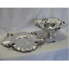 FRUTEIRA (14X30,5X30,5 CM) COM PÉ, CONFECCIONADA EM PRATA 925. POSSUI PRATO FUNDO, QUADRADO, COM RASGO NAS SUAS FACES, ONDE HÁ UM RAMO DE FLORES. ACOMPANHA PRATO (36,5X36,5 CM), NO MESMO ESTILO. ACONDICIONADOS EM ESTOJO FORRADO DE VELUDO AZUL MARINHO. ACOMPANHA CARTÃO DO AGENTE.