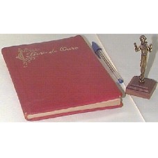 IMAGEM DE SÃO FRANCISCO DE ASSIS (8X1,5 CM) EM BRONZE, EM PÉ COM AS MÃOS LEVANTADAS, FIXADA EM BASE DE MADEIRA (4X4X2 CM), TENDO, EMBAIXO DA MESMA, ETIQUETA COLADA, COM A INSCRIÇÃO 'PETRUS LIVRARIA / 232-7939 - ARARAQUARA - SP'. ACONDICIONADO EM CAIXA (4,5X4,5X9,5 CM) DE PAPELÃO ROXO, COM FURO OVAL NA FRENTE E MESMA ETIQUETA DA PEÇA. ACOMPANHA CADERNO (14,5X21 CM), TIPO BROCHURA, COM CAPA DURA EM NAPA VERMELHA, COM A INSCRIÇÃO 'LIVRO DE OURO' EM DOURADO, NA PARTE DA FRENTE. FOLHAS ENVELHECIDAS, AMARELADAS, COM EXTREMIDADES EM DOURADO; POSSUINDO NA PRIMEIRA PÁGINA A ASSINATURA 'JUSCELINO KUBITSCHEK'. ACONDICIONADOS EM CAIXA SEXTAVADA PRATEADA DE PAPELÃO (26,5X3,5 CM).