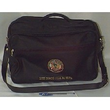 BOLSA DE VIAGEM (37X20,5X29 CM) EM COURO PRETO, FORRADA INTERIORMENTE COM TECIDO PRETO ACETINADO. POSSUI: TRÊS COMPARTIMENTOS E UM BOLSO EXTERNO; UMA ALÇA CURTA, COSTURADA NA BOLSA, E UMA LONGA REMOVÍVEL E REGULÁVEL. NA FRENTE, CENTRALIZADO NO BOLSO, O EMBLEMA DA 'CONFEDERACION SUDAMERICANA DE FUTBOL' BORDADO E COSTURADO NA BOLSA E, 'LUIZ INACIO LULA DA SILVA' BORDADO EM DOURADO NA PRÓPRIA.
