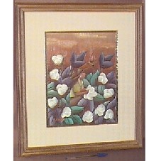 XILOPINTURA (34X26,5 CM) DE ÓLEO SOBRE MADEIRA, COM FIGURA DE UM HOMEM COM CHAPÉU E CAMISA AMARELA COLHENDO O QUE PARECE SER ALGODÃO. PREDOMINA OS TONS DE VIOLETA, VERDE E BRANCO, COM FUNDO EM MARROM CLARO. MOLDURA (44,5X52 CM) EM MADEIRA E PASSE-PARTOUT NA COR CREME. ATRÁS, ETIQUETA COM A INSCRIÇÃO 'AUTOR: ANDRES CAÑETE / TÉCNICA: XILOPINTURA (OLEO S/ MADERA) / ASUNCION - PARAGUAY'. ACOMPANHA CARTÃO DO REMETENTE 'GLORIA PENAYO DE DUARTE / REPUBLICA DEL PARAGUAY' E, CARTÃO EM PAPELÃO FINO, COM INFORMAÇÃO SOBRE A PEÇA: 'ARTISTA: ANDRÉS CAÑETE / TECNICA: XILOPINTURA OLEO S/ MADERA / TEMA: COSECHERO / ASUNCIÓN - PARAGUAY'. VEIO ACONDICIONADO EM CAIXA DE PAPELÃO MICROONDULADO (46,5X54,5X4,5 CM) COM ENFEITE DE FLORES E FOLHAS SECAS NA TAMPA, ARREMATADO POR FITA MARROM CLARO E FITA COM LISTRAS VERMELHA/BRANCA/AZUL, TENDO, AINDA, SELO CIRCULAR DOURADO DA 'REPUBLICA DEL PARAGUAY'.