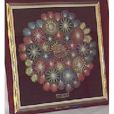 RENDA, TIPO LABIRINTO, EM LINHA FINA, DE DESENHO GEOMÉTRICO (43 CM) FORMANDO VÁRIOS CÍRCULOS E PENTÁGONOS CONCÊNTRICOS, EM DIVERSAS CORES, PREDOMINANDO O AZUL/VERMELHO/VERDE/AMARELO/BRANCO. EMOLDURADA EM QUADRO TIPO SANDUÍCHE DE VIDRO (52,5X53,5 CM), COM MOLDURA EM ALUMÍNIO DOURADO . POSSUI NO CENTRO INFERIOR UMA PLACA DOURADA (7X2 CM), COM A INSCRIÇÃO 'HONORABLE CÁMARA DE DIPUTADOS PARAGUAY / BENJAMIN MACIEL PASOTTI / PRESIDENTE'. ACOMPANHA CARTÃO DE VISITA DO REMETENTE, TENDO NA PARTE POSTERIOR A INSCRIÇÃO 'A SU EXCELENCIA SEÑOR PRESIDENTE DE LA RCA FEDERATIVA DEL BRASIL / ATENTAMENTE / 14-08-03'.