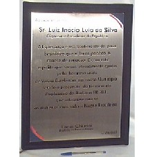 PLACA (30X40X1 CM) EM METAL PRATEADO, COM DETALHES EM DUAS PONTAS EM AZUL E VERMELHO, CONTENDO A GRAVAÇÃO 'AO EXCELENTÍSSIMO SR. LUIZ INÁCIO LULA DA SILVA / DIGNÍSSIMO PRESIDENTE DA REPÚBLICA / A ESPERANÇA É UM SENTIMENTO DO POVO BRASILEIRO QUE O TORNA PACÍFICO E MANSO DE CORAÇÃO. É COM ESTE ESPÍRITO QUE SOMOS ETERNAMENTE GRATOS PELA HONROSA VISITA DE VOSSA EXCELÊNCIA EM NOSSO MUNICÍPIO, SENDO O PRECURSOR DO TÉRMINO DA DUPLICAÇÃO DA RODOVIA BR 381, QUE INTEGRARÁ NÃO SÓ OS MINEIROS MAS TODA A NAÇÃO BRASILEIRA. / ENÉAS CHIARINI / PREFEITO DE POUSO ALEGRE / 18/08/2003'. ACONDICIONADA EM CAIXA (35X45X4 CM) FORRADA DE VELUDO AZUL MARINHO. A TAMPA DA MESMA ESTÁ SOLTA. PLACA FIXADA NA BASE INTERNA DA CAIXA.