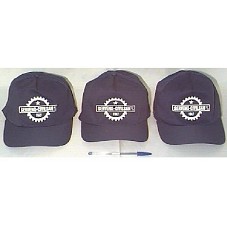 TRÊS BONÉS EM TECIDO AZUL MARINHO, TENDO NA FRENTE A INSCRIÇÃO 'SERVENG-CIVILSAN S/A / 1947', EM BRANCO, JUNTAMENTE COM O SÍMBOLO DA INSTITUIÇÃO.