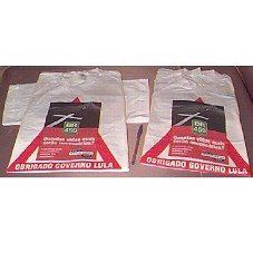 DUAS CAMISETAS (TAM GG) EM MALHA BRANCA, DE MANGA CURTA. NA FRENTE, ESTAMPA COM FOTO DE UMA ESTRADA, TENDO NAS FAIXAS, DESENHOS DE CRUZ; E, EM UM QUADRADO VERMELHO 'QUANTAS VIDAS MAIS SERÃO NECESSÁRIAS? / A SOCIEDADE EXIGE UMA PROVIDÊNCIA DEFINITIVA DAS AUTORIDADES. / ROTA TECNOLÓGICA 459', 'BR 459' EM SÍMBOLO VERDE, E 'OBRIGADO GOVERNO LULA'. ATRÁS, EM RETÂNGULOS AZUIS, 'ROTA TECNOLÓGICA 459'.