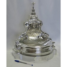RÉPLICA DE FONTE COM PIA (40X32,2X21 CM), CONFECCIONADA EM PRATA, FIXADA EM BASE DE RESINA TRANSPARENTE, QUE SEGUE SEU FORMATO. NA PARTE SUPERIOR DA FONTE, UMA ESTRELA DE MULTIPONTAS (CHEGOU COM ALGUMAS DELAS AMASSADAS).NA LATERAL DIREITA, A INSCRIÇÃO 'FATTO A MANO / G. SACAR (OU G. YACA)'. NA BASE, PLACA METÁLICA CONTENDO A INSCRIÇÃO 'DONO DEL PRESIDENTE DEL CONSIGLIO DEL MINISTRI DELLA REPUBLICA ITALIANA ON. LE SILVIO BERLUSCONI'. ACONDICIONADA EM ESTOJO DE MADEIRA, COM ABERTURA FRONTAL E ALÇA SUPERIOR.
