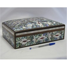 ESTOJO DE MADEIRA (9X30,2X20,3 CM) TRABALHADO COM MOSAICO DE MADREPÉROLA, FORMANDO DESENHO DE FLORES E FOLHAS. POSSUI PARTE INTERNA FORRADA EM TECIDO DE FUNDO PRATEADO, COM FLORES COLORIDAS. NA PARTE INTERNA DA TAMPA, PROTEGIDO POR PLACA DE VIDRO, PAPEL COM A BANDEIRA DO BRASIL E DA SÍRIA IMPRESSA E A INSCRIÇÃO 'SYRIAN ARAB NEWS AGENCY'.