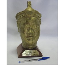 ESCULTURA (22,5X12X15 CM) CONFECCIONADA EM METAL DOURADO, OCA EM SEU INTERIOR. REPRESENTA UM ROSTO FEMININO, COM ADEREÇO NA CABEÇA. FIXADA EM BASE DE MADEIRA (3X11,5X12 CM), ONDE HÁ PLACA COM A INSCRIÇÃO 'WITH THE COMPLIMENTS OF THE PRESIDENT FEDERAL REPUBLIC OF NIGERIA'. ACOMPANHA CARTÃO EM NOME DO AGENTE.