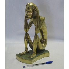 ESCULTURA (28X16X11 CM) CONFECCIONADA EM BRONZE. REPRESENTA UM HOMEM NEGRO SENTADO, COM JOELHOS DOBRADOS E PÉS NO CHÃO, COTOVELOS APOIADOS NOS JOELHOS E A CABEÇA ENTRE AS MÃOS. FIXADO EM BASE DE MESMO MATERIAL, COM PARTE SUPERIOR ESVERDEADA. NA LATERAL DA BASE, A INSCRIÇÃO 'MPAMBUKIDI 05'. ACOMPANHA CARTÃO EM NOME DO AGENTE. ACONDICIONADA EM CAIXA FORRADA DE NAPA VERMELHA, COM BRASÃO DA 'REPÚBLICA DE ANGOLA' NA TAMPA.