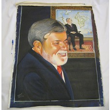 PINTURA (100X72,5 CM) SOBRE TELA, RETRATANDO O PRESIDENTE LULA, TENDO, AO FUNDO, PINTURA DE UM QUADRO RETRATANDO-O NOVAMENTE, SENTADO, COM O MAPA MUNDI AO FUNDO. POSSUI FUNDO DE TOM AZUL MARINHO. NO CANTO INFERIOR ESQUERDO, ASSINATURA DO ARTISTA 'NILSON S / 27/05/2010'.