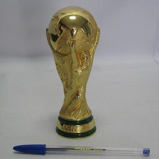 RÉPLICA, EM MINIATURA, DO TROFÉU DA FIFA DA COPA DO MUNDO (15 CM). ESCULTURA CONFECCIONADA EM METAL DOURADO. NA BASE, DUAS LISTRAS ESMALTADAS EM VERDE, E A INSCRIÇÃO 'FIFA WORLD CUP'. NO FUNDO, 'MANUFACTURED UNDER LICENSE BY GLOBAL BRANDS GROUP / MADE IN CHINA / 1974 FIFA TM'. ACONDICIONADA EM ESTOJO PRETO, COM SELO DE PRODUTO OFICIAL LICENCIADO.
