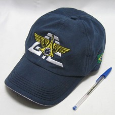 BONÉ EM TECIDO AZUL MARINHO. NA FRENTE, BORDADO EM BRANCO, AS LETRAS 'GTE' E BRASÃO. NAS LATERAIS, BANDEIRA DO BRASIL E 'BRAZILIAN AIR FORCE'. ATRÁS,' VIP CREW'.