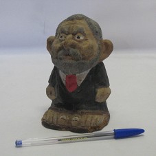 ESCULTURA (13 CM) CONFECCIONADA EM ARGILA, RETRATANDO O PRESIDENTE LULA VESTIDO COM TERNO PRETO, GRAVATA VERMELHA E CHINELOS NOS PÉS. POSSUI ROSTO CARICATURADO. PARTE DA BASE ESTÁ QUEBRADA, APRESENTANDO ALGUNS LASCADOS.