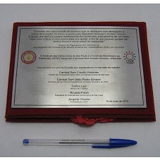 PLACA (13X18 CM) EM METAL PRATEADO. POSSUI UMA CITAÇÃO DO PAPA BENTO XVI E A INSCRIÇÃO '... O SINDICATO DOS COMERCIÁRIOS DE SÃO PAULO E O CENTRO DE ATENDIMENTO AO TRABALHADOR (CEAT) INAUGURAM A UNIDADE DOM CLÁUDIO HUMMES, NESTA DATA. / UMA PARCERIA EM PROL DA INCLUSÃO DOS TRABALHADORES NO MERCADO DE TRABALHO. / (NOMES DE AUTORIDADES) / 18/05/2010'. FIXADA EM BASE FORRADA DE VELUDO VERMELHO, COM TAMPA.