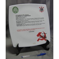 PRATO DECORATIVO (26,5X27 CM) EM PORCELANA BRANCA, COM BORDAS LEVEMENTES ABAULADAS. POSSUI A INSCRIÇÃO '13 DE OUTUBRO DE 1945 - AMISTOSO / PALMEIRAS 3X1CORINTHIANS / ...(DADOS DA PARTIDA DE FUTEBOL: LOCAL, ÁRBITRO, GOLS)... / AO DEPUTADO E ESCRITOR ALDO REBELO, UMA LEMBRANÇA PELO LANÇAMENTO DO LIVRO PALMEIRASXCORINTHIANS, 1945 - O JOGO VERMELHO / 9/ABRIL/2010'. POSSUI BRASÃO DOS TIMES. ACOMPANHA SUPORTE DE MESA, EM PLÁSTICO PRETO.