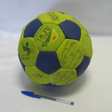 BOLA DE FUTEBOL, NAS CORES VERDE E AZUL, CONFECCIONADA EM TECIDO ECOLÓGICO (A PARTIR DO LÁTEX). POSSUI ESTAMPAS DO GOVERNO FEDERAL, DO GOVERNO DO ESTADO DO ACRE, DO MINISTÉRIO DO ESPORTE, DO FABRICANTE, DE PRODUTO RECICLÁVEL E DA MARCA 'PINTANDO O SETE'. ALÉM DISSO, HÁ DEDICATÓRIAS MANUSCRITAS, DE DIVERSAS PESSOAS, ENTRE ELAS: SENADOR GUIOMAR (AC); SHIRLEY SANTOS; E OUTRAS.
