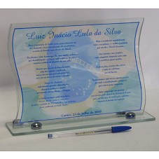 PLACA (18X25 CM) EM VIDRO, EMOLDURANDO IMPRESSO CONTENDO VERSOS EM HOMENAGEM AO PRESIDENTE LUIZ INÁCIO LULA DA SILVA, RESUMINDO SUA TRAJETÓRIA DE VIDA E CARREIRA POLÍTICA. PLACA DATADA DE 23 DE JULHO DE 2010. TEXTO NÃO POSSUI ASSINATURA, NEM COM INDICAÇÃO DE AUTOR. NO INÍCIO, APENAS A INDICAÇÃO DE QUE TERIA SIDO OFERECIDO PELO MUNICÍPIO DE CAETÉS-PE. PLACA FIXADA EM BASE DE MESMO MATERIAL (27X6,5 CM).