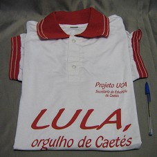 CAMISA GOLA PÓLO, EM MALHA BRANCA, DE MANGA CURTA, COM DETALHES EM VERMELHO. NA FRENTE, EM VERMELHO, A INSCRIÇÃO 'PROJETO UCA / SECRETARIA DE EDUCAÇÃO DE CAETÉS / LULA, ORGULHO DE CAETÉS'. ATRÁS, PRÓXIMO À BARRA, 'ABRA O LAPTOP, ELE TRAZ A INOVAÇÃO, NOS CAMPOS E CIDADES NA EDUCAÇÃO / PEDRO FERREIRA DE ANDRADE'.