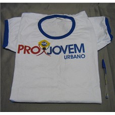CAMISETA (TAM M) EM MALHA BRANCA, DE MANGA CURTA, COM DETALHES EM AZUL. NA FRENTE, ESTAMPA COM A INSCRIÇÃO 'PROJOVEM URBANO / VOLTE A ESTUDAR E GARANTA SEU FUTURO PROFISSIONAL'. ATRÁS, LOGOMARCAS DE INSTITUIÇÕES GOVERNAMENTAIS FEDERAIS E DO ESTADO DE PERNAMBUCO.