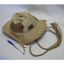 CHAPÉU DE COURO, TIPO VAQUEIRO, NA COR BEGE, COM PARTE SUPERIOR EM PELO MANCHADO. POSSUI CORDÃO E FIVELA DE AJUSTE.