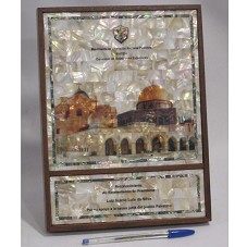 PLACA DE RECONHECIMENTO (28,7X21,8 CM) COM MOLDURA EM MADEIRA, CONFECCIONADA EM MOSAICO DE MADREPÉROLA. POSSUI UM FILME PLÁSTICO COLADO POR CIMA, ONDE FOI IMPRESSO A INSCRIÇÃO 'MOVIMIENTO DE LIBERACIÓN NACIONAL PALESTINA / FATEH / COMISION DE RELACIONES EXTERIORES / RECONOCIMIENTO AL EXCELENTÍSIMO SR. PRESIDENTE LUIZ INÁCIO LULA DA SILVA / POR SU APOYO A LA CAUSA JUSTA DEL PUEBLO PALESTINO'. AO CENTRO, FOTOGRAFIA DE UMA CONSTRUÇÃO TÍPICA DO LOCAL. ACONDICIONDA EM CAIXA BEGE, COM A INSCRIÇÃO 'MARC CHAJALL' NA TAMPA.